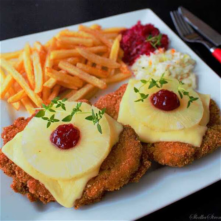 Gegratineerde varkens- of kipschnitzel met Parmigiana saus, ham, ananas en kaas geserveerd met friet of aardappelen en salade